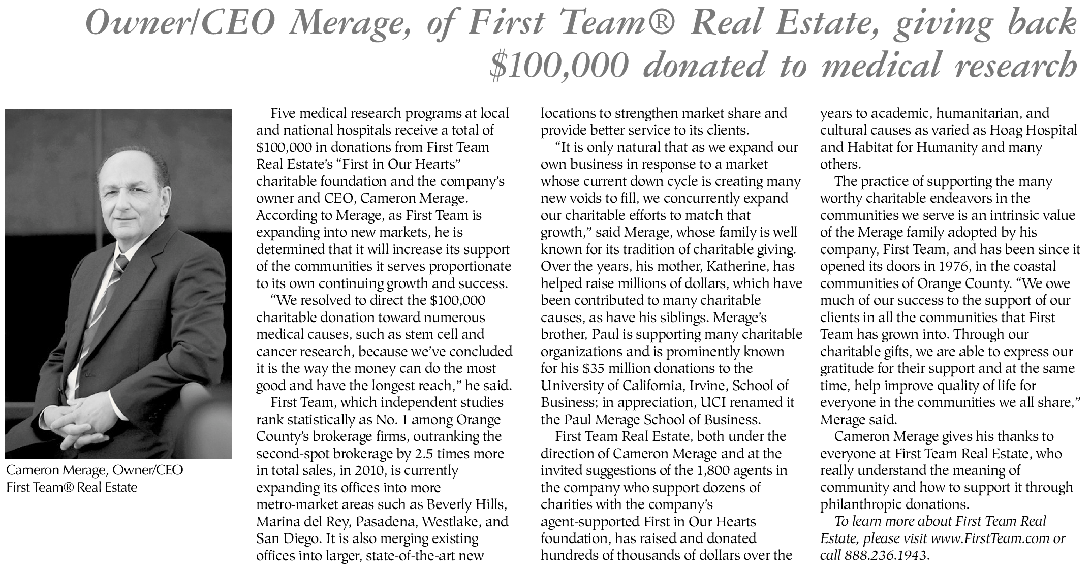 Five medical research programs at local and national hospitals receive a total of $100,000 in donations from First Team Real Estate’s “First in Our Hearts” charitable foundation and the company’s owner and CEO, Cameron Merage. According to Merage, as First Team is expanding into new markets, he is determined that it will increase its support of the communities it serves proportionate to its own continuing growth and success.