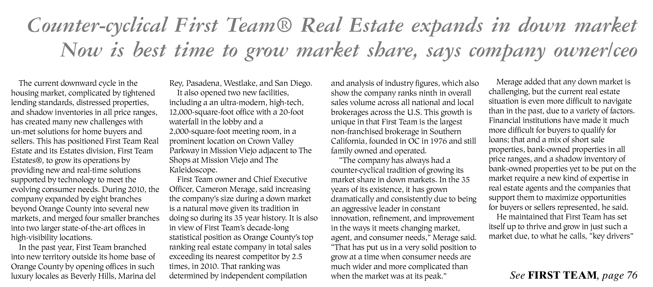 First Team owner and Chief Executive Officer, Cameron Merage, said increasing the company’s size during a down market is a natural move given its tradition in doing so during its 35 year history. It is also in view of First Team’s decade-long statistical position as Orange County’s top ranking real estate company in total sales exceeding its nearest competitor by 2.5 times, in 2010. That ranking was determined by independent compilation