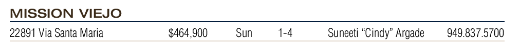 MISSION VIEJO 22891 Via Santa Maria $464,900 Sun 1-4 Suneeti “Cindy” Argade 949.837.5700