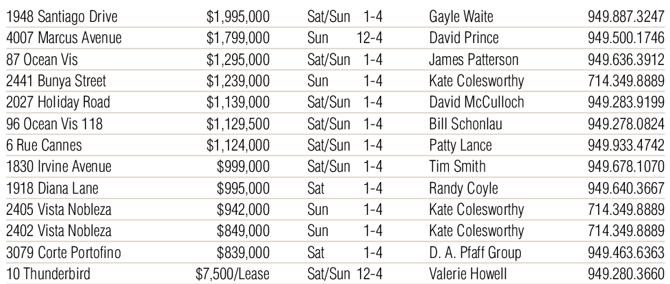 1948 Santiago Drive $1,995,000 Sat/Sun 1-4 Gayle Waite 949.887.3247 4007 Marcus Avenue $1,799,000 Sun 12-4 David Prince 949.500.1746 87 Ocean Vis $1,295,000 Sat/Sun 1-4 James Patterson 949.636.3912 2441 Bunya Street $1,239,000 Sun 1-4 Kate Colesworthy 714.349.8889 2027 Holiday Road $1,139,000 Sat/Sun 1-4 David McCulloch 949.283.9199 96 Ocean Vis 118 $1,129,500 Sat/Sun 1-4 Bill Schonlau 949.278.0824 6 Rue Cannes $1,124,000 Sat/Sun 1-4 Patty Lance 949.933.4742 1830 Irvine Avenue $999,000 Sat/Sun 1-4 Tim Smith 949.678.1070 1918 Diana Lane $995,000 Sat 1-4 Randy Coyle 949.640.3667 2405 Vista Nobleza $942,000 Sun 1-4 Kate Colesworthy 714.349.8889 2402 Vista Nobleza $849,000 Sun 1-4 Kate Colesworthy 714.349.8889 3079 Corte Portofino $839,000 Sat 1-4 D. A. Pfaff Group 949.463.6363 10 Thunderbird $7,500/Lease Sat/Sun 12-4 Valerie Howell 949.280.3660