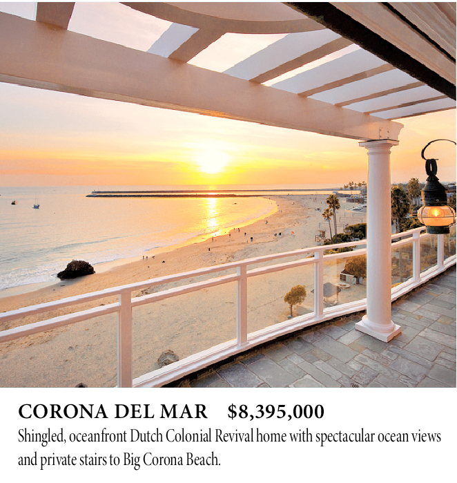 CORONA DEL MAR $8,395,000 Shingled, oceanfront Dutch Colonial Revival home with spectacular ocean views and private stairs to Big Corona Beach.