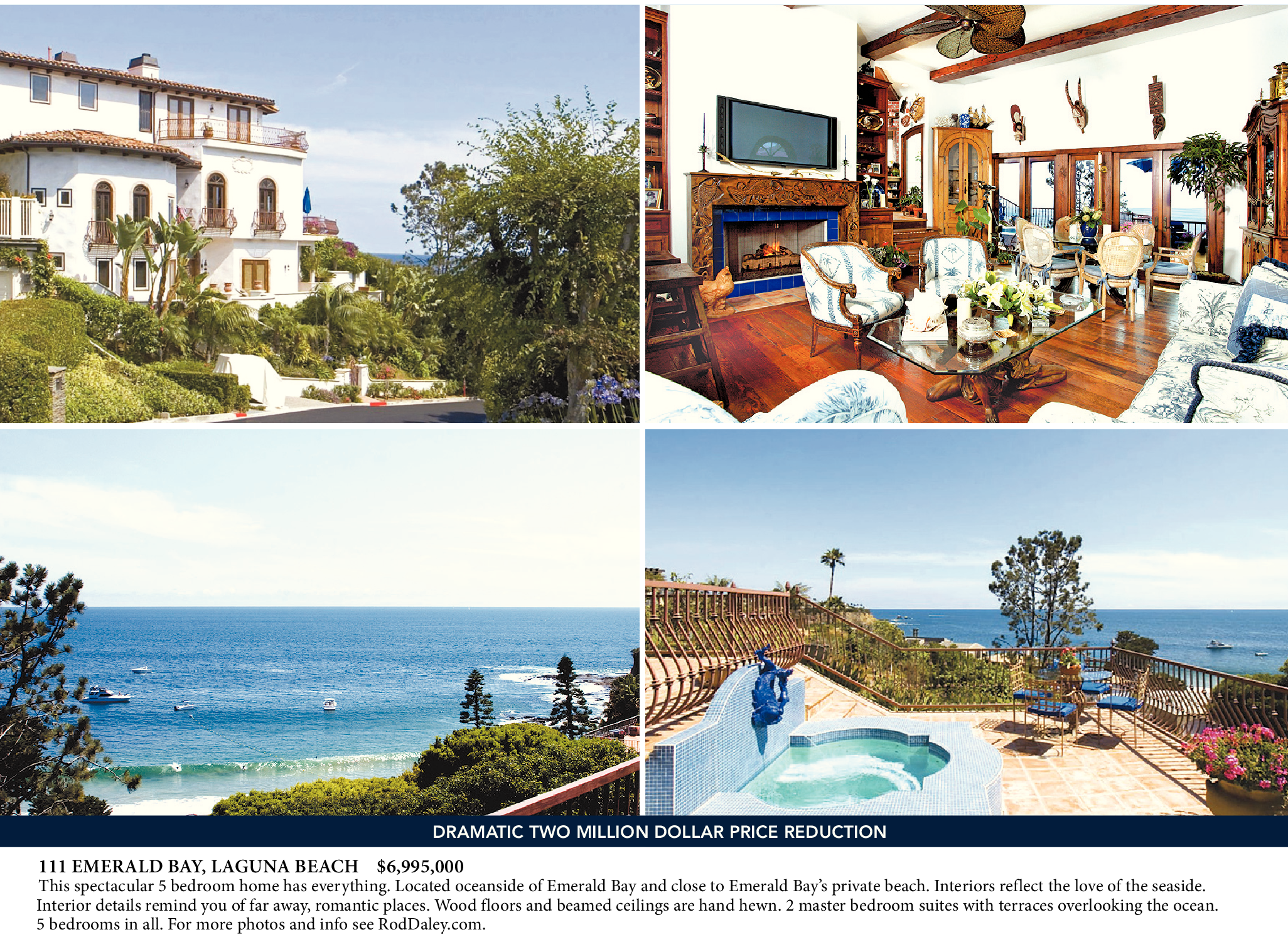 DRAMATIC TWO MILLION DOLLAR PRICE REDUCTION 111 EMERALD BAY, LAGUNA BEACH $6,995,000 This spectacular 5 bedroom home has everything. Located oceanside of Emerald Bay and close to Emerald Bay’s private beach. Interiors reflect the love of the seaside. Interior details remind you of far away, romantic places. Wood floors and beamed ceilings are hand hewn. 2 master bedroom suites with terraces overlooking the ocean. 5 bedrooms in all. For more photos and info see RodDaley.com.