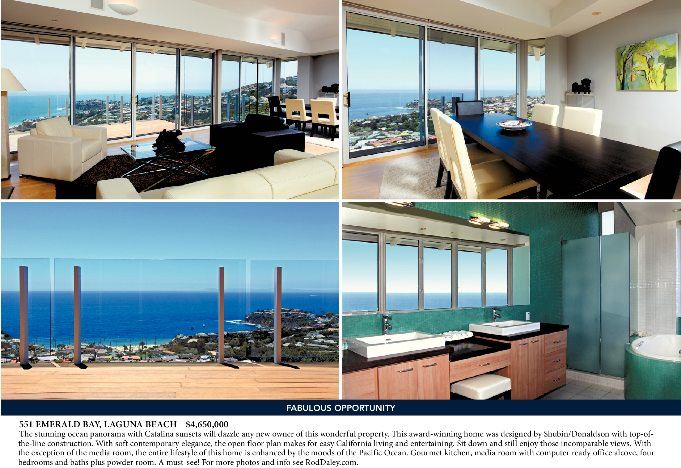 551 EMERALD BAY, LAGUNA BEACH $4,650,000 The stunning ocean panorama with Catalina sunsets will dazzle any new owner of this wonderful property. This award-winning home was designed by Shubin/Donaldson with top-ofthe-line construction. With soft contemporary elegance, the open floor plan makes for easy California living and entertaining. Sit down and still enjoy those incomparable views. With the exception of the media room, the entire lifestyle of this home is enhanced by the moods of the Pacific Ocean. Gourmet kitchen, media room with computer ready office alcove, four bedrooms and baths plus powder room. A must-see! For more photos and info see RodDaley.com. FABULOUS OPPORTUNITY