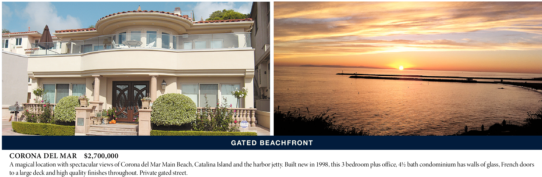 CORONA DEL MAR $2,700,000 A magical location with spectacular views of Corona del Mar Main Beach, Catalina Island and the harbor jetty. Built new in 1998, this 3 bedroom plus office, 4½ bath condominium has walls of glass, French doors to a large deck and high quality finishes throughout. Private gated street.