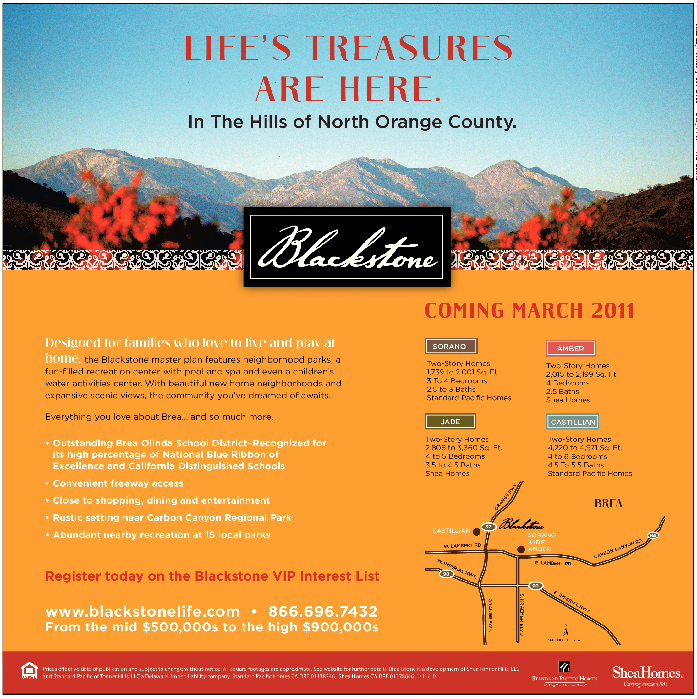 Prices effective date of publication and subject to change without notice. All square footages are approximate. See website for further details. Blackstone is a development of Shea Tonner Hills, LLC and Standard Pacific of Tonner Hills, LLC a Delaware limited liability company. Standard Pacific Homes CA DRE 01138346. Shea Homes CA DRE 01378646 .1/11/10