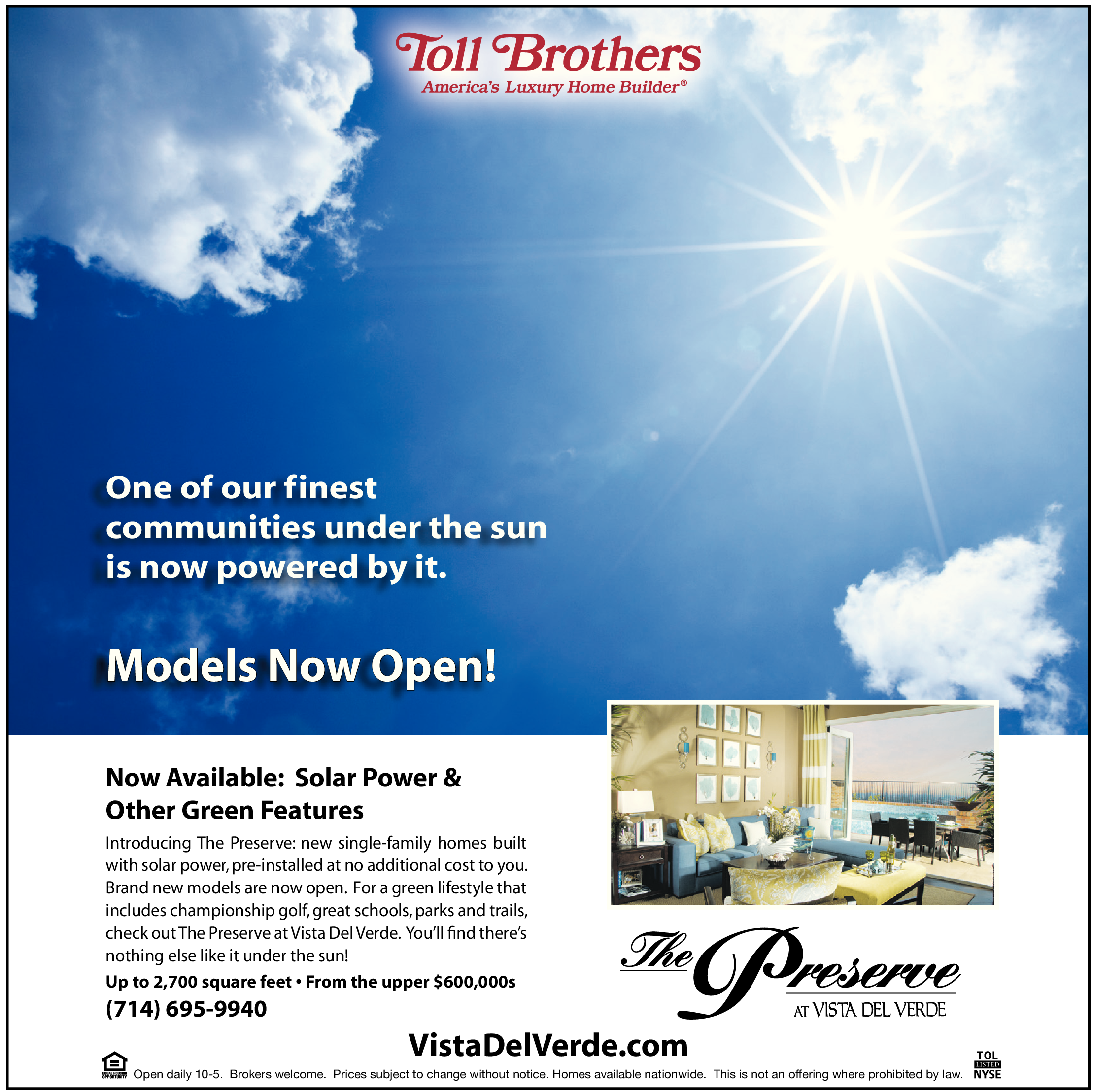 Introducing The Preserve: new single-family homes built with solar power, pre-installed at no additional cost to you. Brand new models are now open. For a green lifestyle that includes championship golf, great schools, parks and trails, check out The Preserve at Vista Del Verde. You’ll find there’s nothing else like it under the sun!