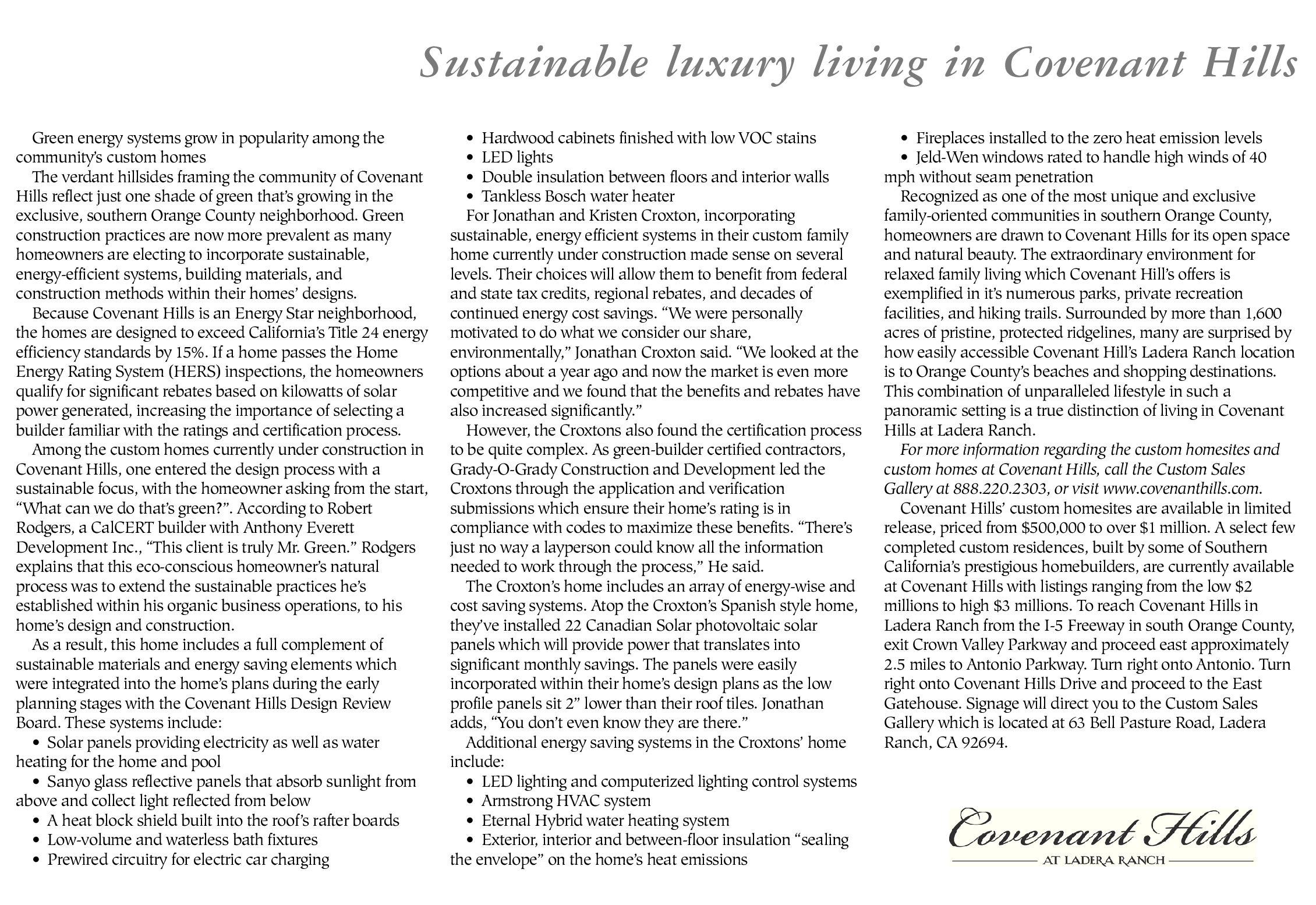 Green energy systems grow in popularity among the community’s custom homes The verdant hillsides framing the community of Covenant Hills reflect just one shade of green that’s growing in the exclusive, southern Orange County neighborhood. Green construction practices are now more prevalent as many homeowners are electing to incorporate sustainable, energy-efficient systems, building materials, and construction methods within their homes’ designs.