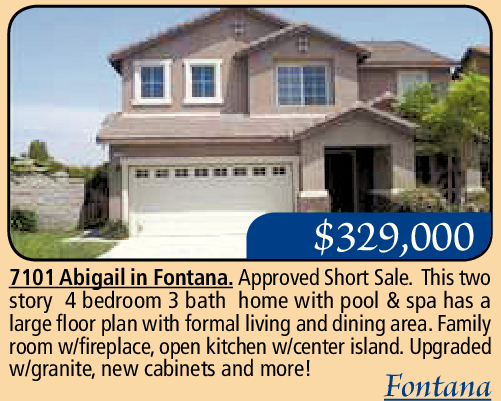 7101 Abigail in Fontana. Approved Short Sale. This two story 4 bedroom 3 bath home with pool & spa has a large floor plan with formal living and dining area. Family room w/fireplace, open kitchen w/center island. Upgraded w/granite, new cabinets and more!