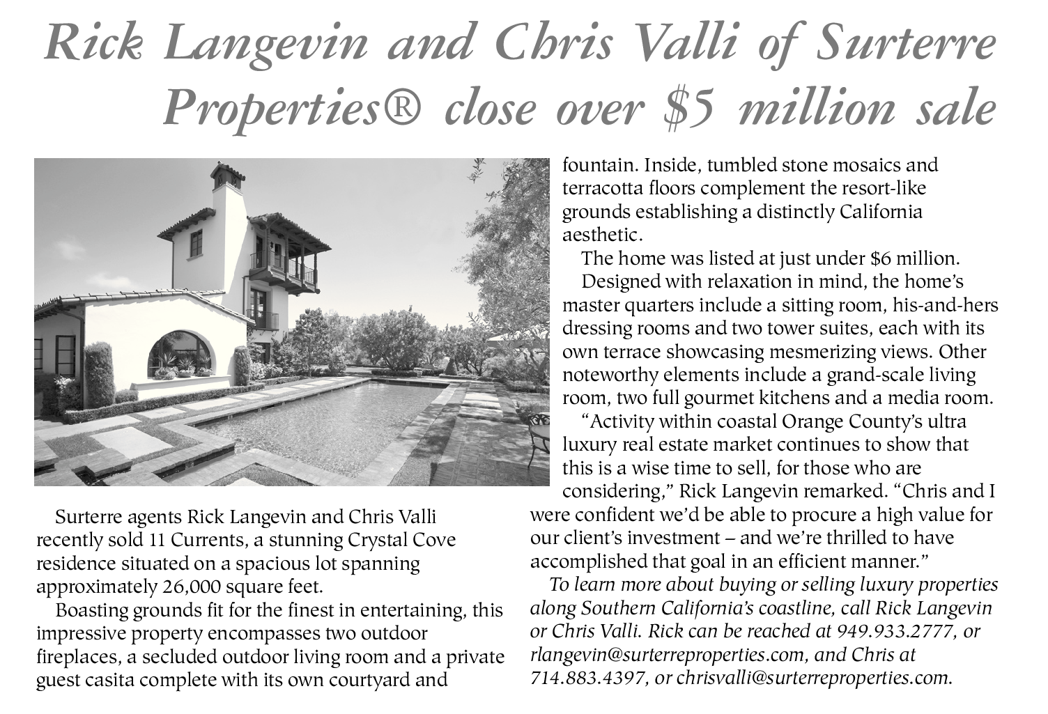 To learn more about buying or selling luxury properties along Southern California’s coastline, call Rick Langevin or Chris Valli. Rick can be reached at 949.933.2777, or rlangevin@surterreproperties.com, and Chris at 714.883.4397, or chrisvalli@surterreproperties.com.
