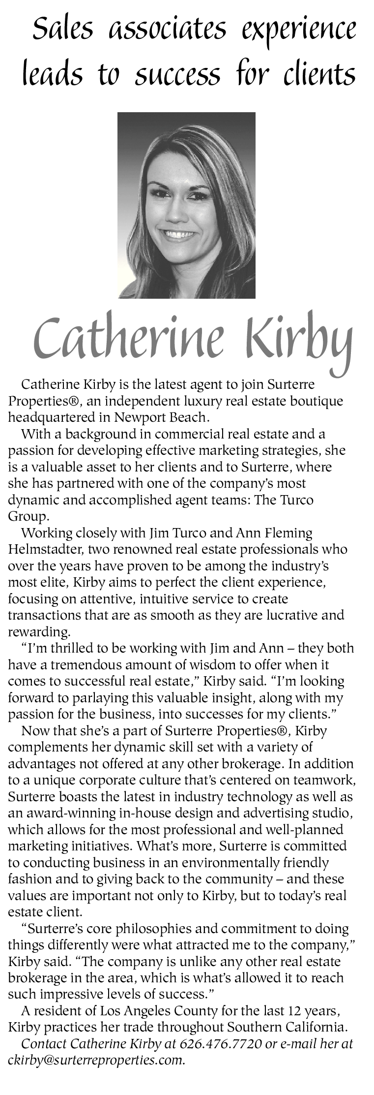 Contact Catherine Kirby at 626.476.7720 or e-mail her at ckirby@surterreproperties.com.