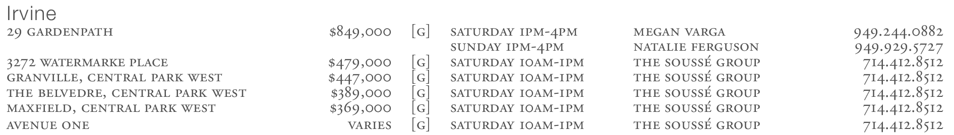 Irvine 29 gardenpath $849,000 [g] saturday 1pm-4pm megan varga 949.244.0882 sunday 1pm-4pm natalie ferguson 949.929.5727 3272 watermarke place $479,000 [g] saturday 10am-1pm the soussé group 714.412.8512 granville, central park west $447,000 [g] saturday 10am-1pm the soussé group 714.412.8512 the belvedre, central park west $389,000 [g] saturday 10am-1pm the soussé group 714.412.8512 maxfield, central park west $369,000 [g] saturday 10am-1pm the soussé group 714.412.8512 avenue one varies [g] saturday 10am-1pm the soussé group 714.412.8512