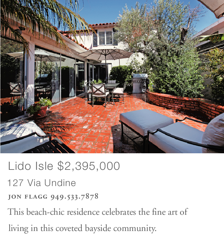 Lido Isle $2,395,000 127 Via Undine jon flagg 949.533.7878 This beach-chic residence celebrates the fine art of living in this coveted bayside community.