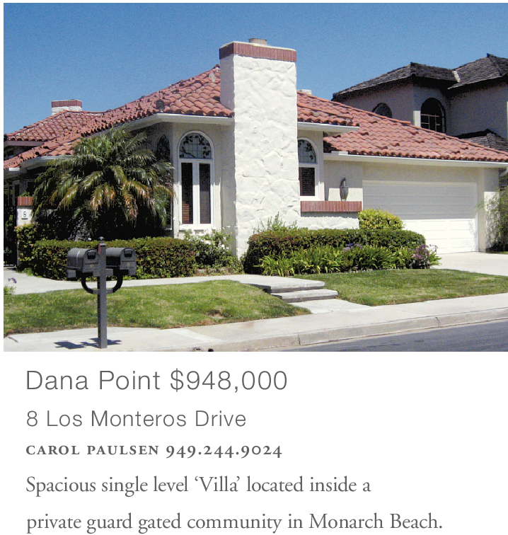 Dana Point $948,000 8 Los Monteros Drive carol paulsen 949.244.9024 Spacious single level ‘Villa’ located inside a private guard gated community in Monarch Beach.