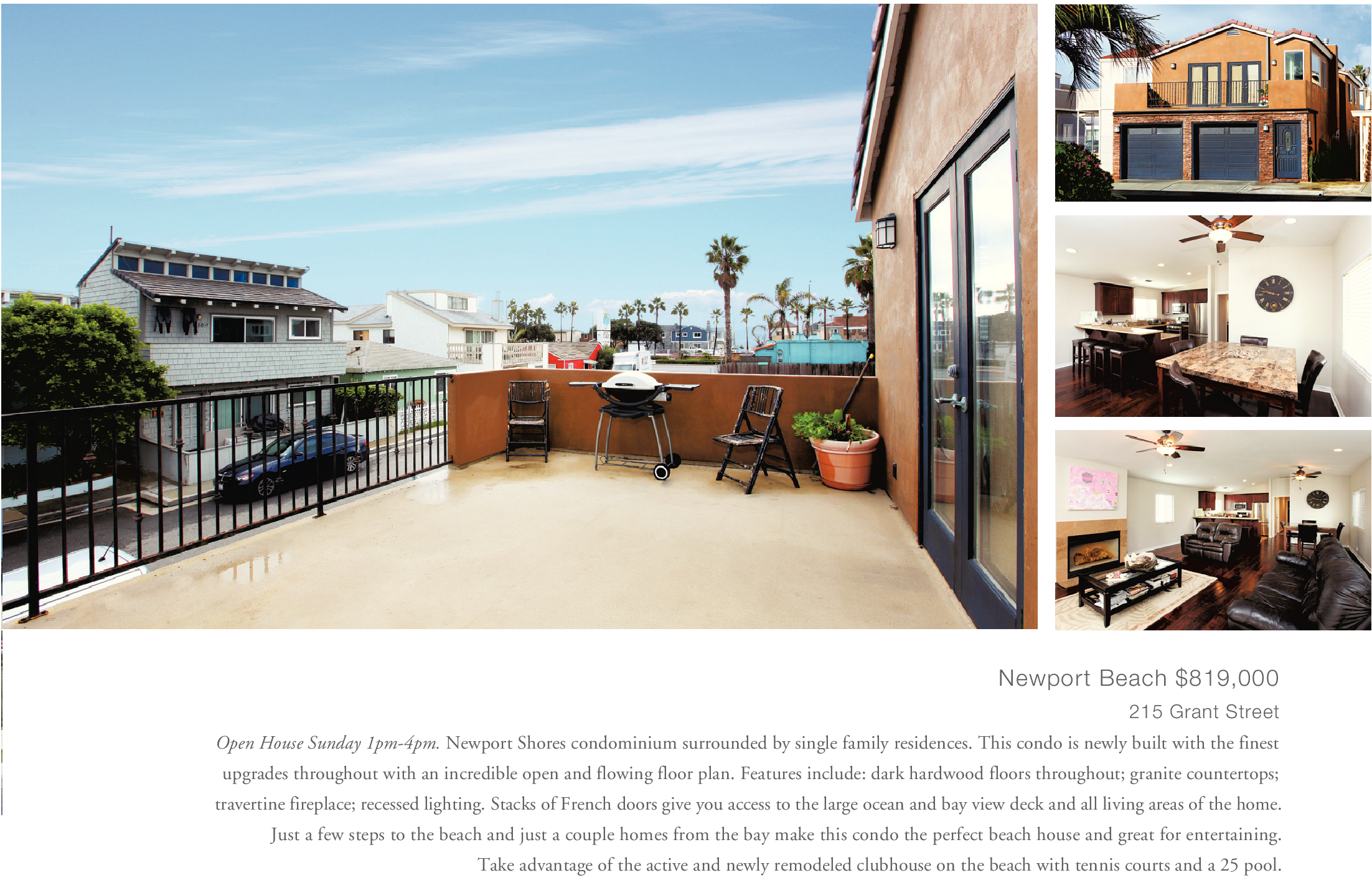 Newport Beach $819,000 215 Grant Street Open House Sunday 1pm-4pm. Newport Shores condominium surrounded by single family residences. This condo is newly built with the finest upgrades throughout with an incredible open and flowing floor plan. Features include: dark hardwood floors throughout; granite countertops; travertine fireplace; recessed lighting. Stacks of French doors give you access to the large ocean and bay view deck and all living areas of the home. Just a few steps to the beach and just a couple homes from the bay make this condo the perfect beach house and great for entertaining. Take advantage of the active and newly remodeled clubhouse on the beach with tennis courts and a 25 pool.