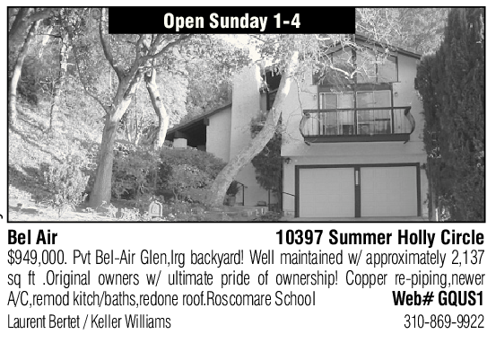 Open Sunday 1-4 Bel Air 10397 Summer Holly Circle $949,000. Pvt Bel-Air Glen,lrg backyard! Well maintained w/ approximately 2,137 sq ft .Original owners w/ ultimate pride of ownership! Copper re-piping,newer A/C,remod kitch/baths,redone roof.Roscomare School Web# GQUS1 Laurent Bertet / Keller Williams 310-869-9922 See also