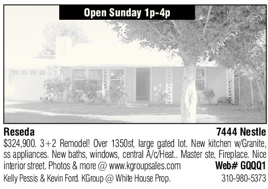 Reseda 7444 Nestle $324,900. 3+2 Remodel! Over 1350sf, large gated lot. New kitchen w/Granite, ss appliances. New baths, windows, central A/c/Heat.. Master ste, Fireplace. Nice interior street. Photos & more @ www.kgroupsales.com Web# GQQQ1 Kelly Pessis & Kevin Ford. KGroup @ White House Prop. 310-980-5373
