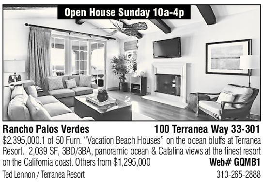 Open House Sunday 10a-4p Rancho Palos Verdes 100 Terranea Way 33-301 $2,395,000.1 of 50 Furn. “Vacation Beach Houses” on the ocean bluffs at Terranea Resort. 2,039 SF, 3BD/3BA, panoramic ocean & Catalina views at the finest resort on the California coast. Others from $1,295,000 Web# GQMB1 Ted Lennon / Terranea Resort 310-265-2888