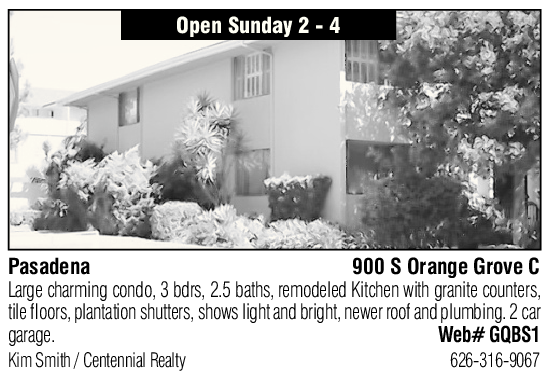 Open Sunday 2 - 4 Pasadena 900 S Orange Grove C Large charming condo, 3 bdrs, 2.5 baths, remodeled Kitchen with granite counters, tile floors, plantation shutters, shows light and bright, newer roof and plumbing. 2 car garage. Web# GQBS1 Kim Smith / Centennial Realty 626-316-9067