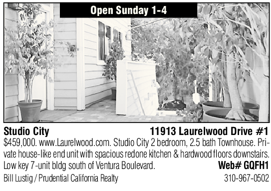 Studio City 11913 Laurelwood Drive #1 $459,000. www.Laurelwood.com. Studio City 2 bedroom, 2.5 bath Townhouse. Private house-like end unit with spacious redone kitchen & hardwood floors downstairs. Low key 7-unit bldg south of Ventura Boulevard. Web# GQFH1 Bill Lustig / Prudential California Realty 310-967-0502