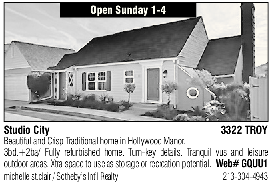 Studio City 3322 TROY Beautiful and Crisp Traditional home in Hollywood Manor. 3bd.+2ba/ Fully refurbished home. Turn-key details. Tranquil vus and leisure outdoor areas. Xtra space to use as storage or recreation potential. Web# GQUU1 michelle st.clair / Sotheby’s Int’l Realty 213-304-4943