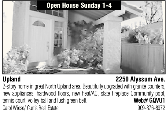 Upland 2250 Alyssum Ave. 2-story home in great North Upland area. Beautifully upgraded with granite counters, new appliances, hardwood floors, new heat/AC, slate fireplace Community pool, tennis court, volley ball and lush green belt. Web# GQVU1 Carol Wiese/ Curtis Real Estate 909-376-8972