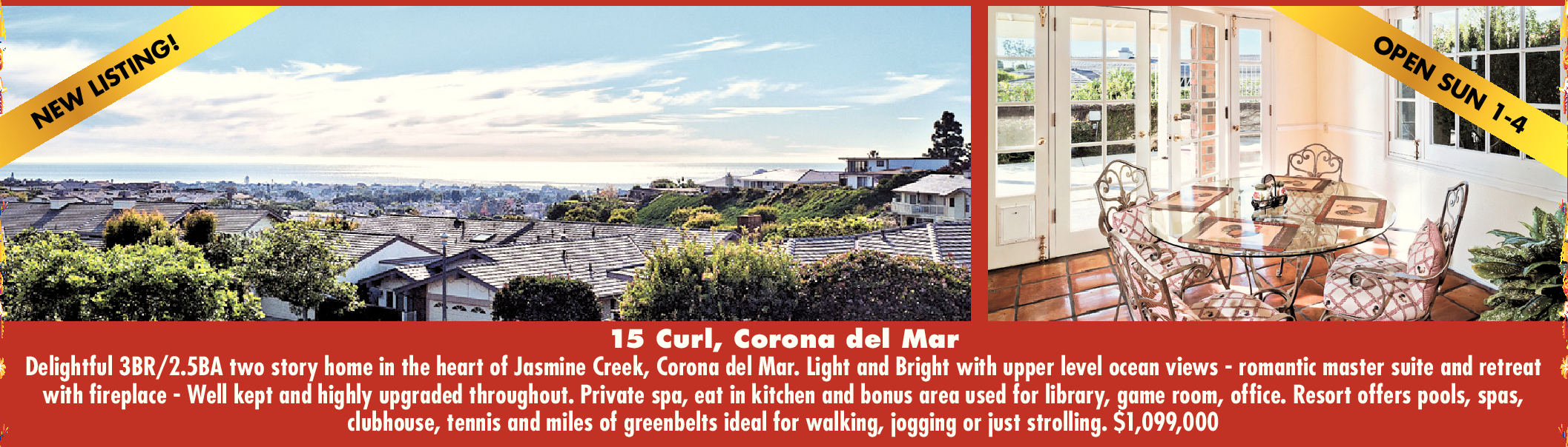 15 Curl, Corona del Mar Delightful 3BR/2.5BA two story home in the heart of Jasmine Creek, Corona del Mar. Light and Bright with upper level ocean views - romantic master suite and retreat with fireplace - Well kept and highly upgraded throughout. Private spa, eat in kitchen and bonus area used for library, game room, office. Resort offers pools, spas, clubhouse, tennis and miles of greenbelts ideal for walking, jogging or just strolling. $1,099,000
