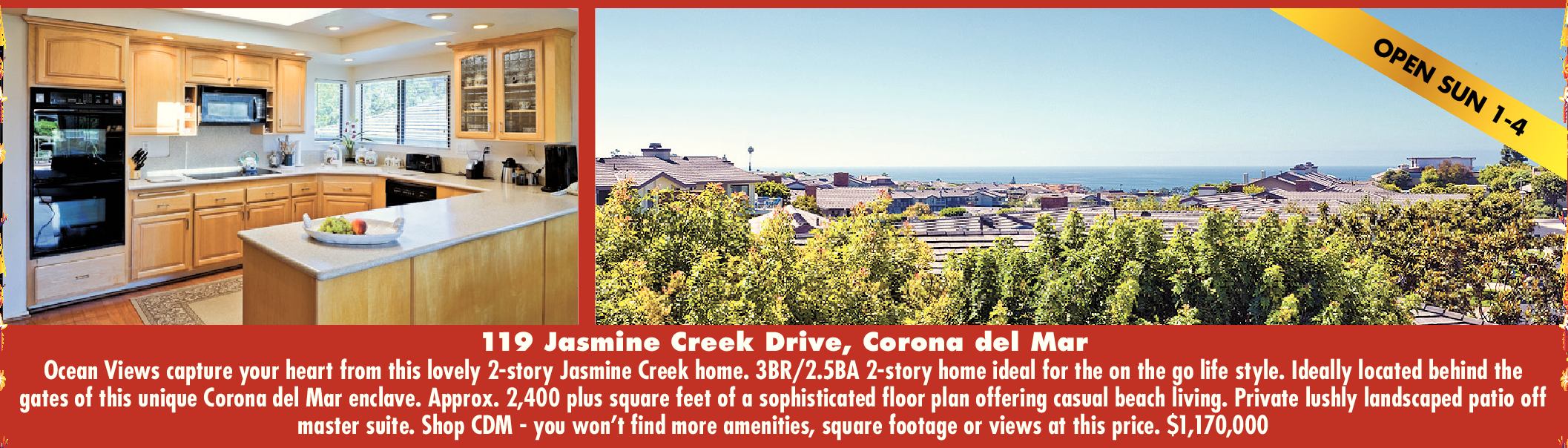 119 Jasmine Creek Drive, Corona del Mar Ocean Views capture your heart from this lovely 2-story Jasmine Creek home. 3BR/2.5BA 2-story home ideal for the on the go life style. Ideally located behind the gates of this unique Corona del Mar enclave. Approx. 2,400 plus square feet of a sophisticated floor plan offering casual beach living. Private lushly landscaped patio off master suite. Shop CDM - you won’t find more amenities, square footage or views at this price. $1,170,000