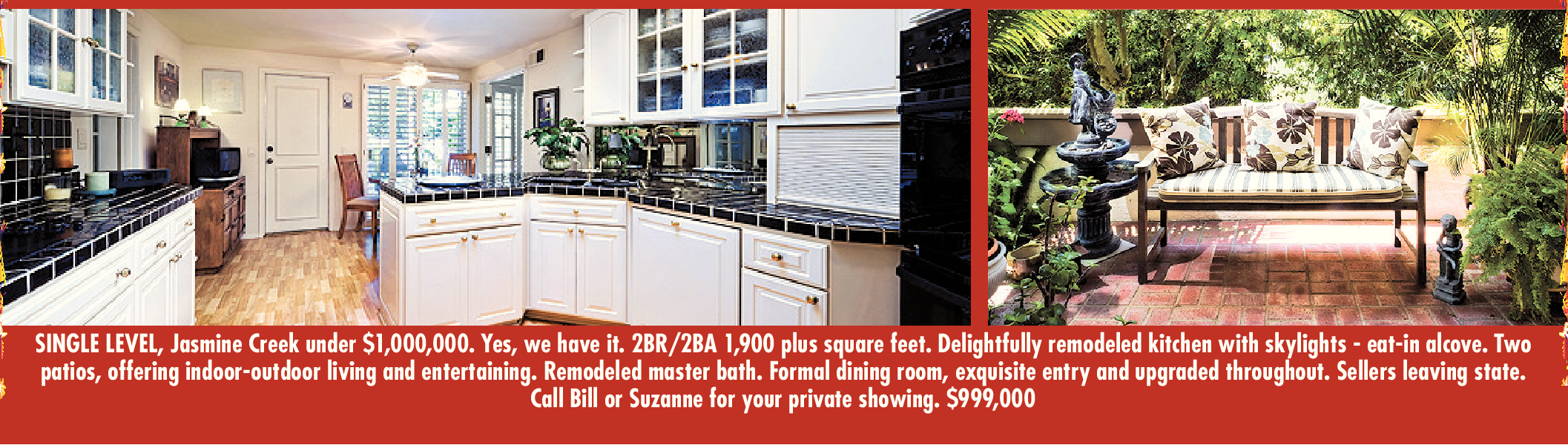 SINGLE LEVEL, Jasmine Creek under $1,000,000. Yes, we have it. 2BR/2BA 1,900 plus square feet. Delightfully remodeled kitchen with skylights - eat-in alcove. Two patios, offering indoor-outdoor living and entertaining. Remodeled master bath. Formal dining room, exquisite entry and upgraded throughout. Sellers leaving state. Call Bill or Suzanne for your private showing. $999,000