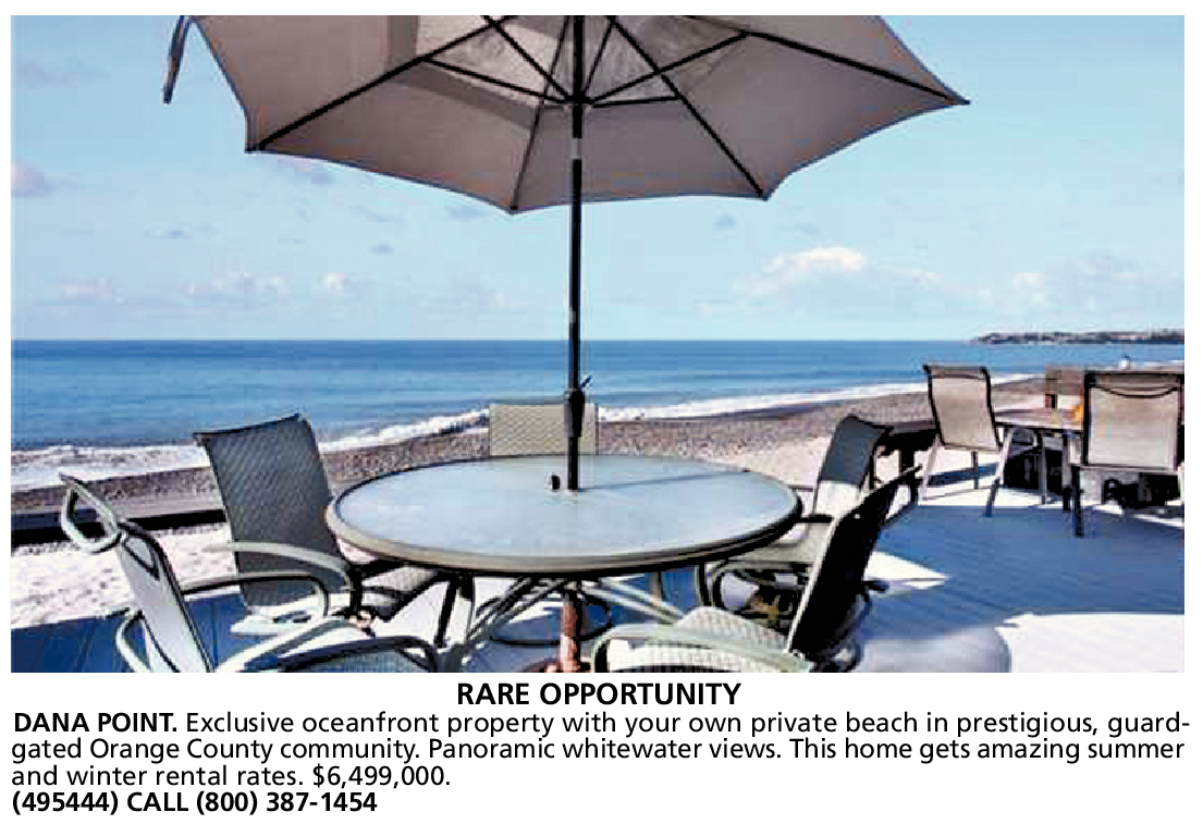 RARE OPPORTUNITY DANA POINT. Exclusive oceanfront property with your own private beach in prestigious, guardgated Orange County community. Panoramic whitewater views. This home gets amazing summer and winter rental rates. $6,499,000. (495444) CALL (800) 387-1454