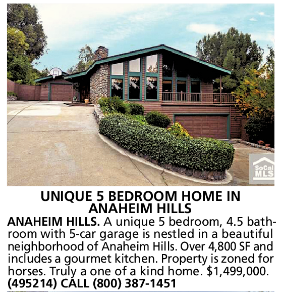 UNIQUE 5 BEDROOM HOME IN ANAHEIM HILLS ANAHEIM HILLS. A unique 5 bedroom, 4.5 bathroom with 5-car garage is nestled in a beautiful neighborhood of Anaheim Hills. Over 4,800 SF and includes a gourmet kitchen. Property is zoned for horses. Truly a one of a kind home. $1,499,000. (495214) CALL (800) 387-1451
