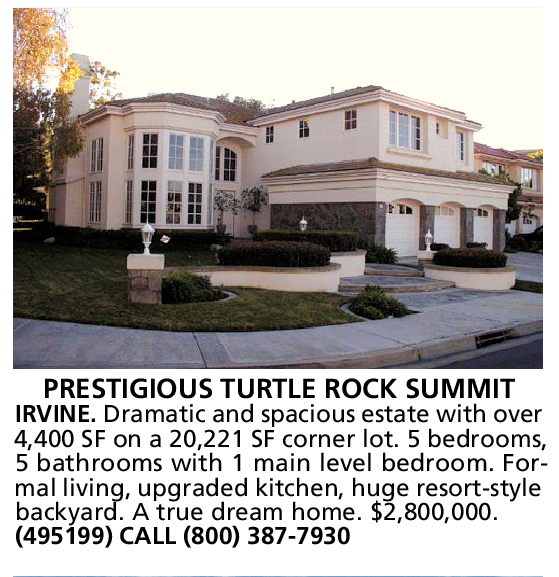 PRESTIGIOUS TURTLE ROCK SUMMIT IRVINE. Dramatic and spacious estate with over 4,400 SF on a 20,221 SF corner lot. 5 bedrooms, 5 bathrooms with 1 main level bedroom. Formal living, upgraded kitchen, huge resort-style backyard. A true dream home. $2,800,000. (495199) CALL (800) 387-7930