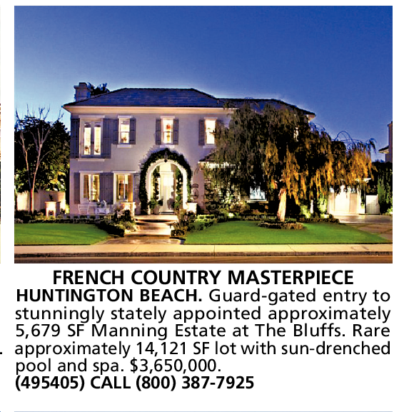 features the JM community. FRENCH COUNTRY MASTERPIECE HUNTINGTON BEACH. Guard-gated entry to stunningly stately appointed approximately 5,679 SF Manning Estate at The Bluffs. Rare approximately 14,121 SF lot with sun-drenched pool and spa. $3,650,000. (495405) CALL (800) 387-7925