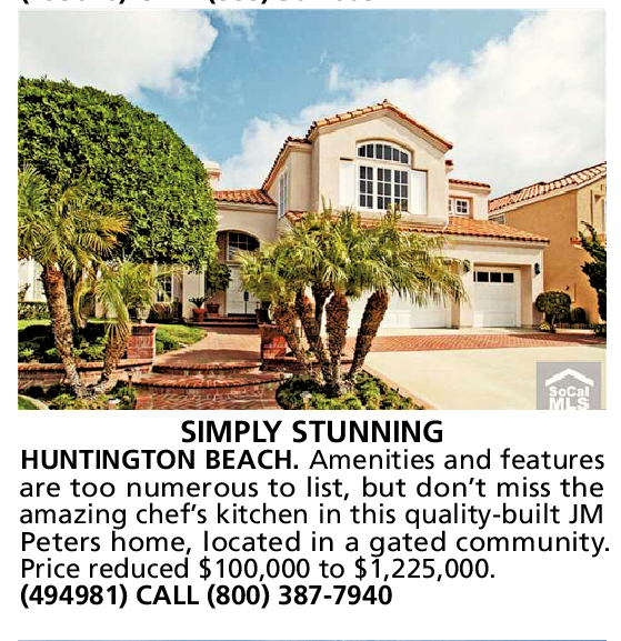 suite. (495076) CALL (888) 307-0052 SIMPLY STUNNING HUNTINGTON BEACH. Amenities and features are too numerous to list, but don’t miss the amazing chef’s kitchen in this quality-built JM Peters home, located in a gated community. Price reduced $100,000 to $1,225,000. (494981) CALL (800) 387-7940