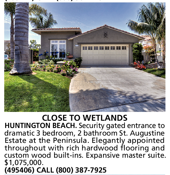 (495214) CALL (800) 387-1451 CLOSE TO WETLANDS HUNTINGTON BEACH. Security gated entrance to dramatic 3 bedroom, 2 bathroom St. Augustine Estate at the Peninsula. Elegantly appointed throughout with rich hardwood flooring and custom wood built-ins. Expansive master suite. $1,075,000. (495406) CALL (800) 387-7925