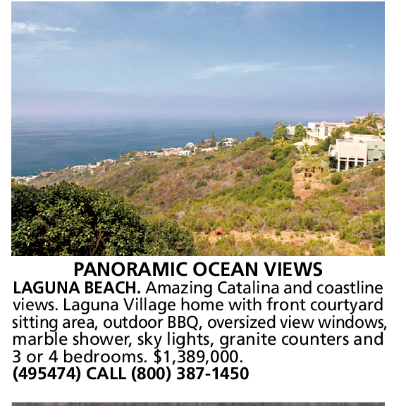 PANORAMIC OCEAN VIEWS LAGUNA BEACH. Amazing Catalina and coastline views. Laguna Village home with front courtyard sitting area, outdoor BBQ, oversized view windows, marble shower, sky lights, granite counters and 3 or 4 bedrooms. $1,389,000. (495474) CALL (800) 387-1450