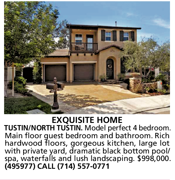 EXQUISITE HOME TUSTIN/NORTH TUSTIN. Model perfect 4 bedroom. Main floor guest bedroom and bathroom. Rich hardwood floors, gorgeous kitchen, large lot with private yard, dramatic black bottom pool/ spa, waterfalls and lush landscaping. $998,000. (495977) CALL (714) 557-0771
