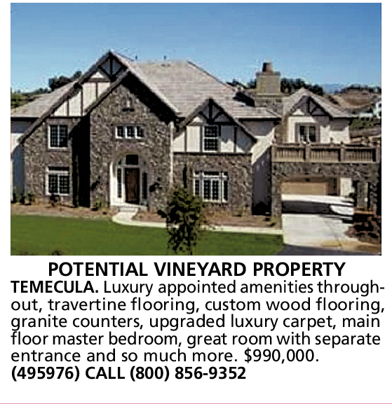 POTENTIAL VINEYARD PROPERTY TEMECULA. Luxury appointed amenities throughout, travertine flooring, custom wood flooring, granite counters, upgraded luxury carpet, main floor master bedroom, great room with separate entrance and so much more. $990,000. (495976) CALL (800) 856-9352