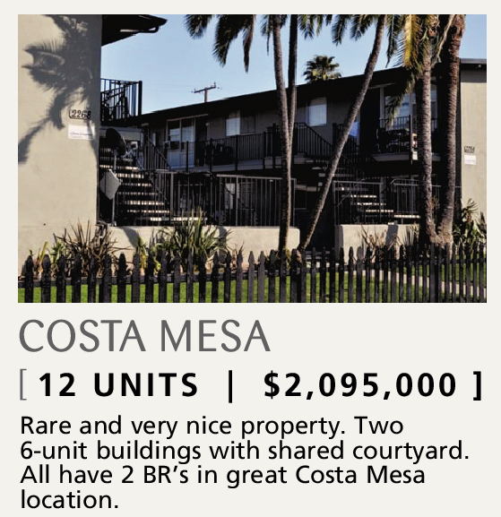 Rare and very nice property. Two 6-unit buildings with shared courtyard. All have 2 BR’s in great Costa Mesa location.