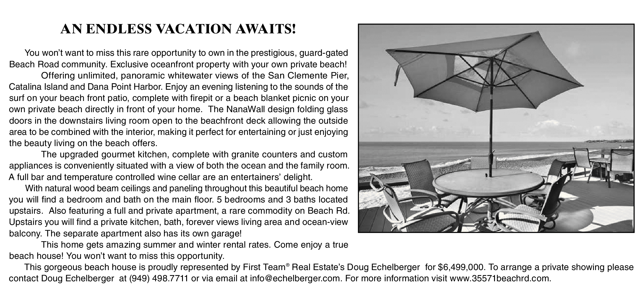 This gorgeous beach house is proudly represented by First Team ® Real Estate’s Doug Echelberger for $6,499,000. To arrange a private showing please contact Doug Echelberger at (949) 498.7711 or via email at info@echelberger.com. For more information visit www.35571beachrd.com.