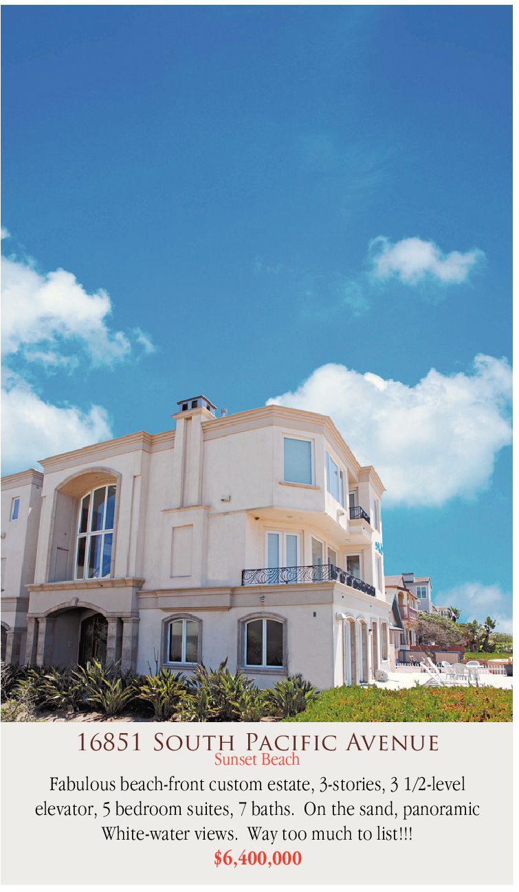16851 South Pacific Avenue Sunset Beach Fabulous beach-front custom estate, 3-stories, 3 1/2-level elevator, 5 bedroom suites, 7 baths. On the sand, panoramic White-water views. Way too much to list!!!