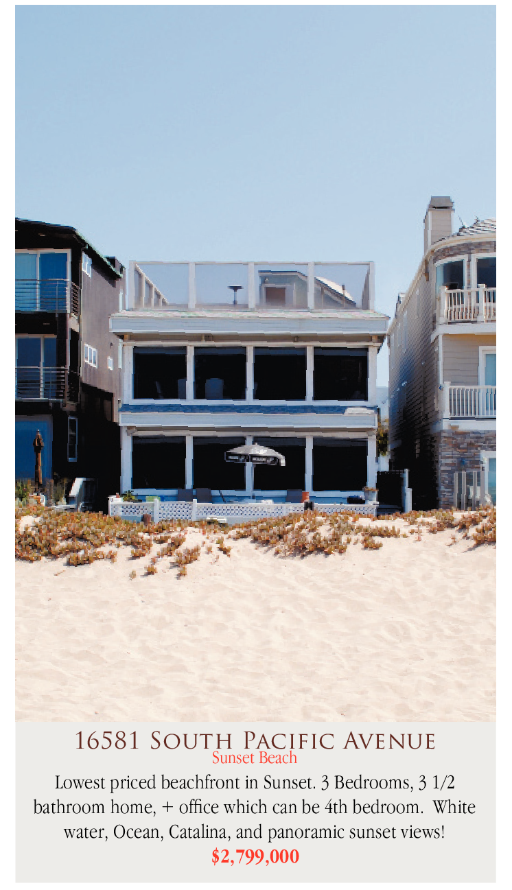 16581 South Pacific Avenue Sunset Beach Lowest priced beachfront in Sunset. 3 Bedrooms, 3 1/2 bathroom home, + office which can be 4th bedroom. White water, Ocean, Catalina, and panoramic sunset views!
