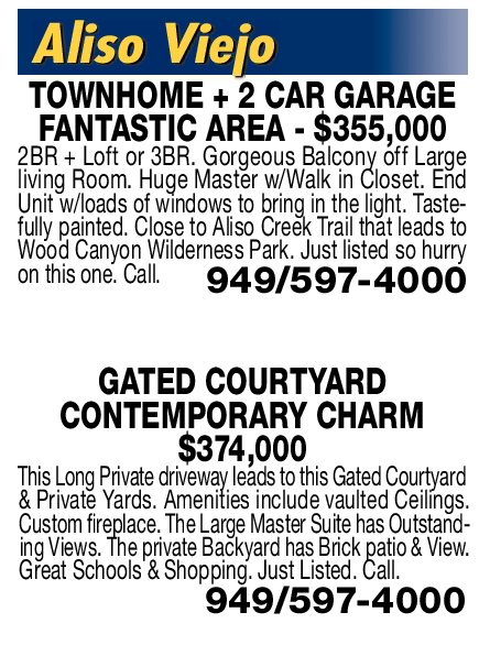Aliso Viejo TOWNHOME + 2 CAR GARAGE FANTASTIC AREA - $355,000 2BR + Loft or 3BR. Gorgeous Balcony off Large living Room. Huge Master w/Walk in Closet. End Unit w/loads of windows to bring in the light. Tastefully painted. Close to Aliso Creek Trail that leads to Wood Canyon Wilderness Park. Just listed so hurry on this one. Call. 949/597-4000 GATED COURTYARD CONTEMPORARY CHARM $374,000 This Long Private driveway leads to this Gated Courtyard & Private Yards. Amenities include vaulted Ceilings. Custom fireplace. The Large Master Suite has Outstanding Views. The private Backyard has Brick patio & View. Great Schools & Shopping. Just Listed. Call. 949/597-4000
