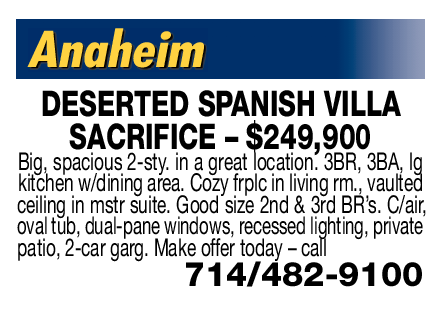 DESERTED SPANISH VILLA SACRIFICE – $249,900 Big, spacious 2-sty. in a great location. 3BR, 3BA, lg kitchen w/dining area. Cozy frplc in living rm., vaulted ceiling in mstr suite. Good size 2nd & 3rd BR’s. C/air, oval tub, dual-pane windows, recessed lighting, private patio, 2-car garg. Make offer today – call 714/482-9100