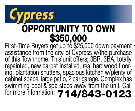 Cypress OPPORTUNITY TO OWN $350,000 First-Time Buyers get up to $25,000 down payment assistance from the city of Cypress w/the purchase of this Townhome. This unit offers; 3BR, 3BA, totally repainted, new carpet installed, real hardwood flooring, plantation shutters, spacious kitchen w/plenty of cabinet space, large patio, 2 car garage. Complex has swimming pool & spa steps away from the unit. Call for more information. 714/843-0123 –