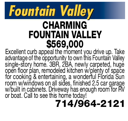 Fountain Valley CHARMING FOUNTAIN VALLEY $569,000 Excellent curb appeal the moment you drive up. Take advantage of the opportunity to own this Fountain Valley single-story home. 3BR, 2BA, newly carpeted, huge open floor plan, remodeled kitchen w/plenty of space for cooking & entertaining, a wonderful Florida Sun room w/windows on all sides, finished 2.5 car garage w/built in cabinets. Driveway has enough room for RV or boat. Call to see this home today! 714/964-2121