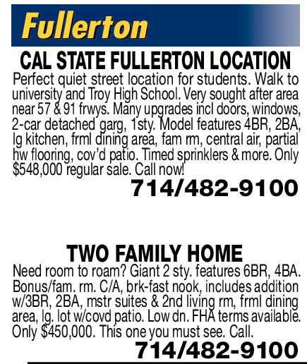 Fullerton CAL STATE FULLERTON LOCATION Perfect quiet street location for students. Walk to university and Troy High School. Very sought after area near 57 & 91 frwys. Many upgrades incl doors, windows, 2-car detached garg, 1sty. Model features 4BR, 2BA, lg kitchen, frml dining area, fam rm, central air, partial hw flooring, cov’d patio. Timed sprinklers & more. Only $548,000 regular sale. Call now! 714/482-9100 TWO FAMILY HOME Need room to roam? Giant 2 sty. features 6BR, 4BA. Bonus/fam. rm. C/A, brk-fast nook, includes addition w/3BR, 2BA, mstr suites & 2nd living rm, frml dining area, lg. lot w/covd patio. Low dn. FHA terms available. Only $450,000. This one you must see. Call. 714/482-9100