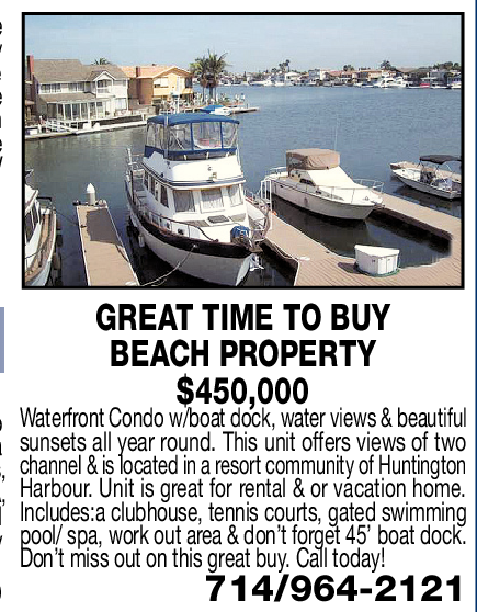Take Valley huge space Sun garage RV 714/964-2121 GREAT TIME TO BUY BEACH PROPERTY $450,000 to Waterfront Condo w/boat dock, water views & beautiful area sunsets all year round. This unit offers views of two windows, channel & is located in a resort community of Huntington 2BA, Harbour. Unit is great for rental & or vacation home. Includes:a clubhouse, tennis courts, gated swimming Only pool/ spa, work out area & don’t forget 45’ boat dock. Don’t miss out on this great buy. Call today! 714/482-9100 714/964-2121