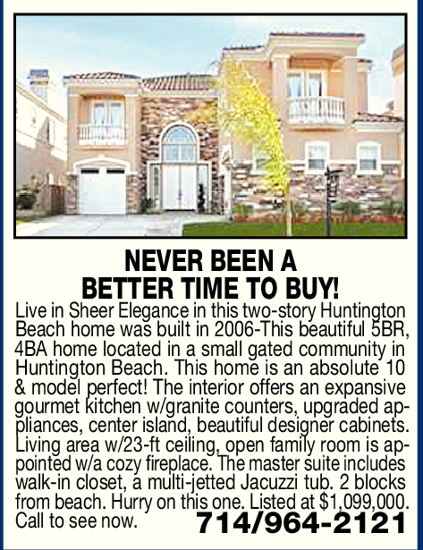 Living area w/23-ft ceiling, open family room is appointed w/a cozy fireplace. The master suite includes walk-in closet, a multi-jetted Jacuzzi tub. 2 blocks from beach. Hurry on this one. Listed at $1,099,000. Call to see now. 714/964-2121