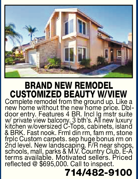 BRAND NEW REMODEL CUSTOMIZED BEAUTY W/VIEW Complete remodel from the ground up. Like a new home without the new home price. Dbldoor entry. Features 4 BR. Incl lg mstr suite w/ private view balcony. 3 bth’s. All new luxury kitchen w/oversized C-Tops, cabinets, island & BRK. Fast nook. Frml din rm, fam rm, stone frplc Custom carpets. sep huge bonus rm on 2nd level. New landscaping. F/R near shops, schools, mall, parks & M.V. Country Club. E-A terms available. Motivated sellers. Priced reflected @ $695,000. Call to inspect. 714/482-9100