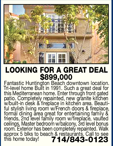 LOOKING FOR A GREAT DEAL $899,000 Fantastic Huntington Beach downtown location. Tri-level home Built in 1991. Such a great deal for this Mediterranean home. Enter through front gated patio. Completely repainted, new granite kitchen w/built-in desk & fireplace in kitchen area. Beautiful stylish living room w/French doors & fireplace, formal dining area great for entertaining family & friends, 2nd level family room w/fireplace, vaulted ceilings, Master bedroom w/balcony, 3rd level bonus room. Exterior has been completely repainted. Walk approx 5 blks to beach & restaurants. Call to see this home today! 714/843-0123